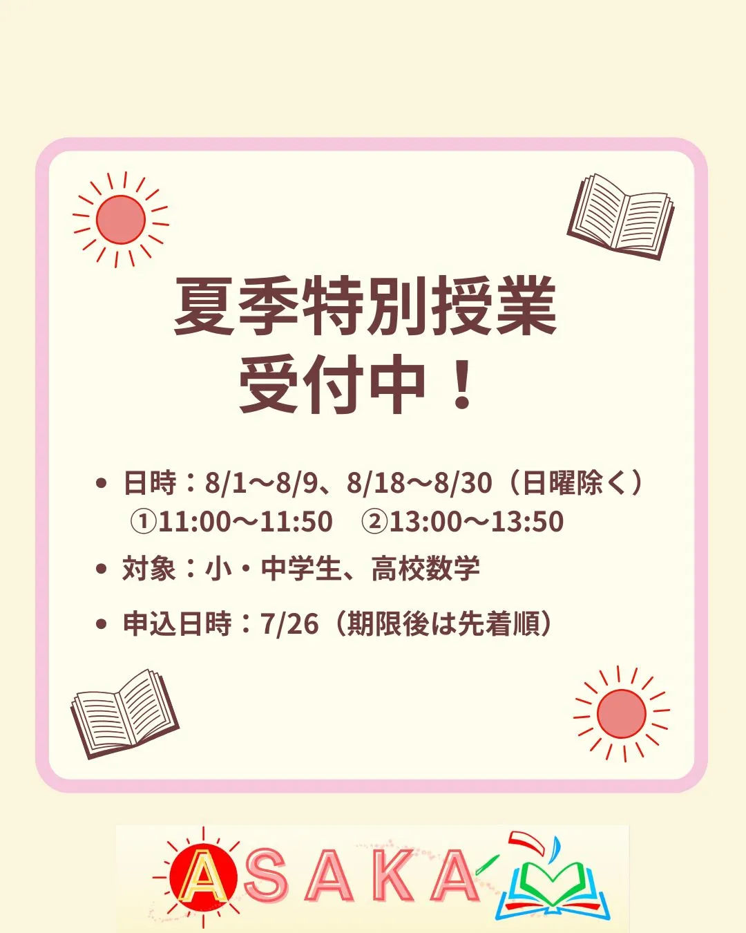 📢【夏季特別授業 本日締切!】 📢【夏季特別授業本日締切!】8月実施の夏季特別授業、いよいよ本日7/26(土)が申込締切です!📘対象:小・中学生/高校数学対応📝内容:宿題・復習・苦手克服…なんでもOK!🕐授業時間:11:00〜11:50/13:00…