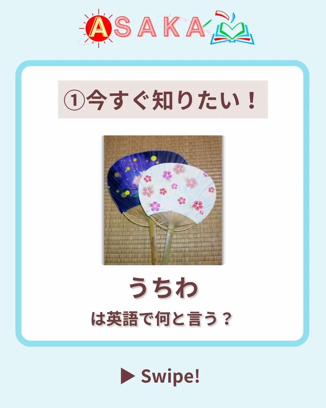 📢【夏のプチ英語 第4弾】 📢【夏のプチ英語第4弾】これ、英語でなんて言う?🎐✨日本の夏の風物詩「うちわ」実は英語ではroundpaperfanと言います!文化紹介ではそのままuchiwaと呼んでもOK👍他にも“fan”や“paperfan”という言い方もあ…