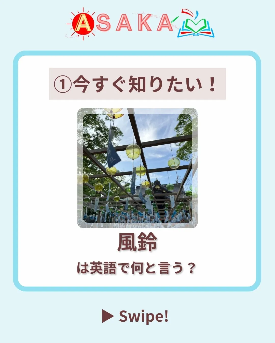 📢【夏のプチ英語 第6弾】 📢【夏のプチ英語第6弾】これ、英語でなんて言う?🎐✨夏の風物詩「風鈴」英語ではwindchimeと言います💡💡豆知識“wind”=風、“chime”=鐘の音→直訳で「風で鳴る鐘」英語圏では「癒し」「リラックス効果」の象…